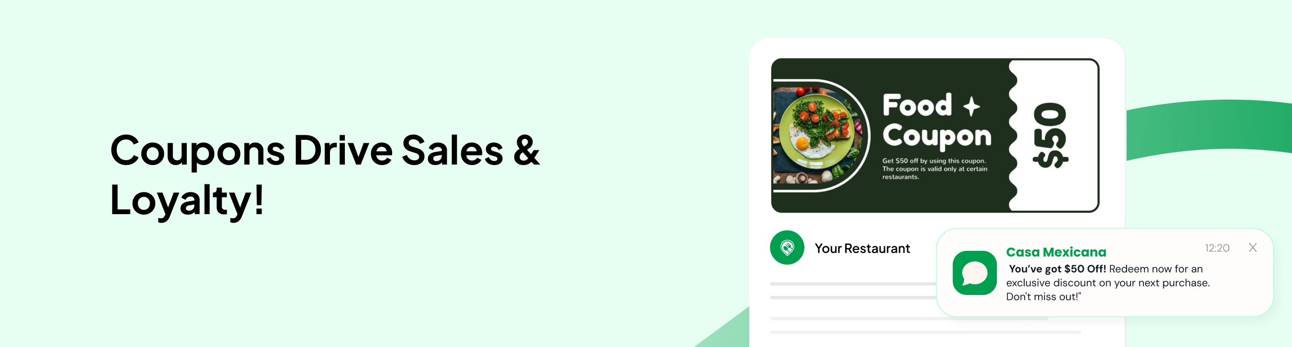 Successful restaurants know that a well-designed coupon creates urgency, encourages repeat business, and gets new customers through the door. And with Restro, you can create and automate targeted coupons directly through your restaurant website and mobile app — making it easier than ever to boost sales.